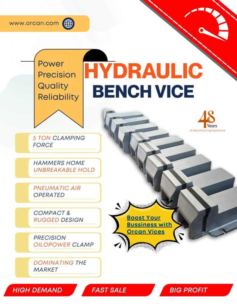 Orcan Hydraulic Bench Vice is engineered for professionals who demand superior clamping force, smooth operation, and long‑term durability. Designed for workshops, fabrication units, maintenance bays, and heavy‑duty industrial environments, Orcan vices combine robust construction with hydraulic efficiency to handle the toughest jobs.